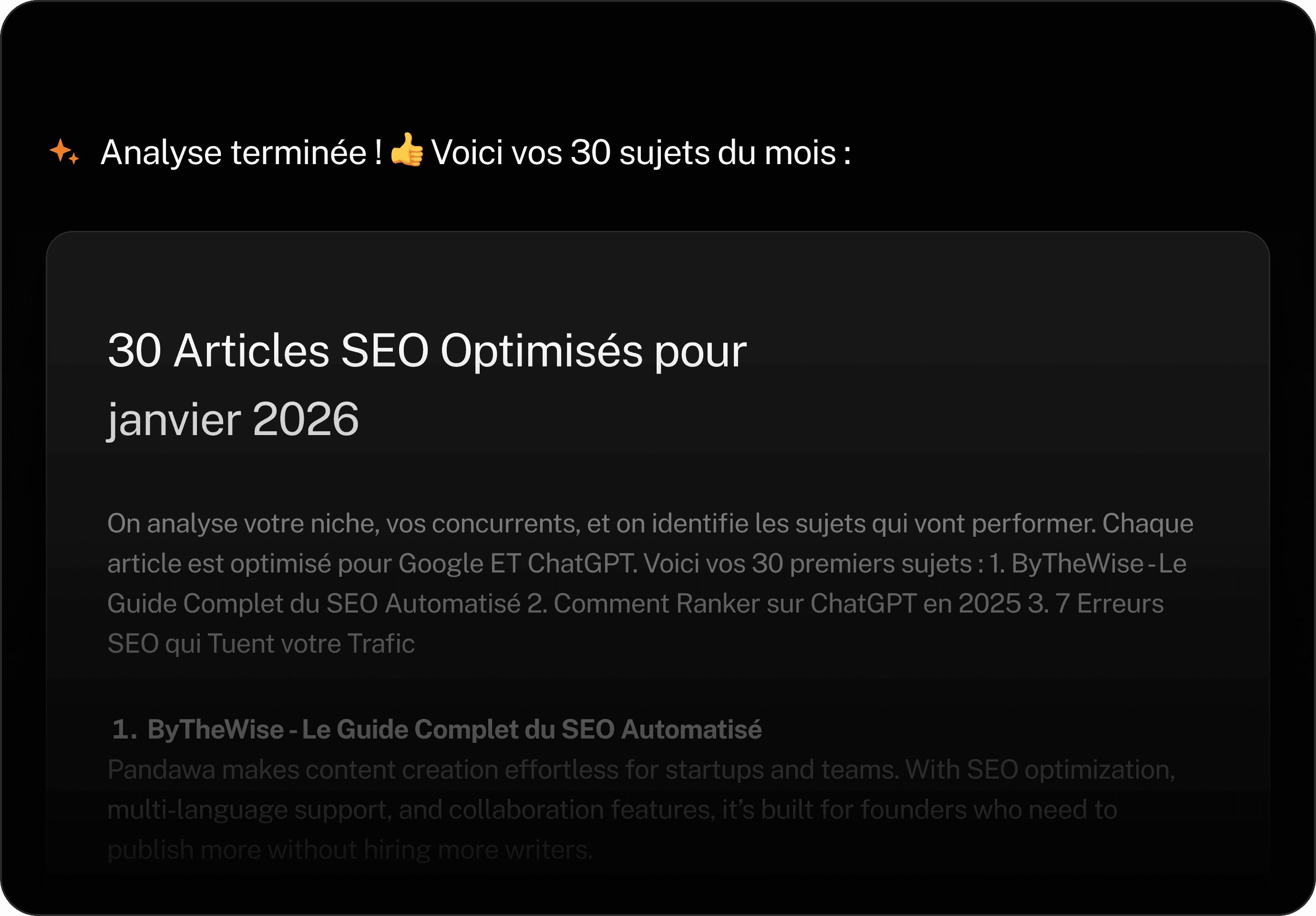 Créez 30 articles optimisés Google + ChatGPT chaque mois.