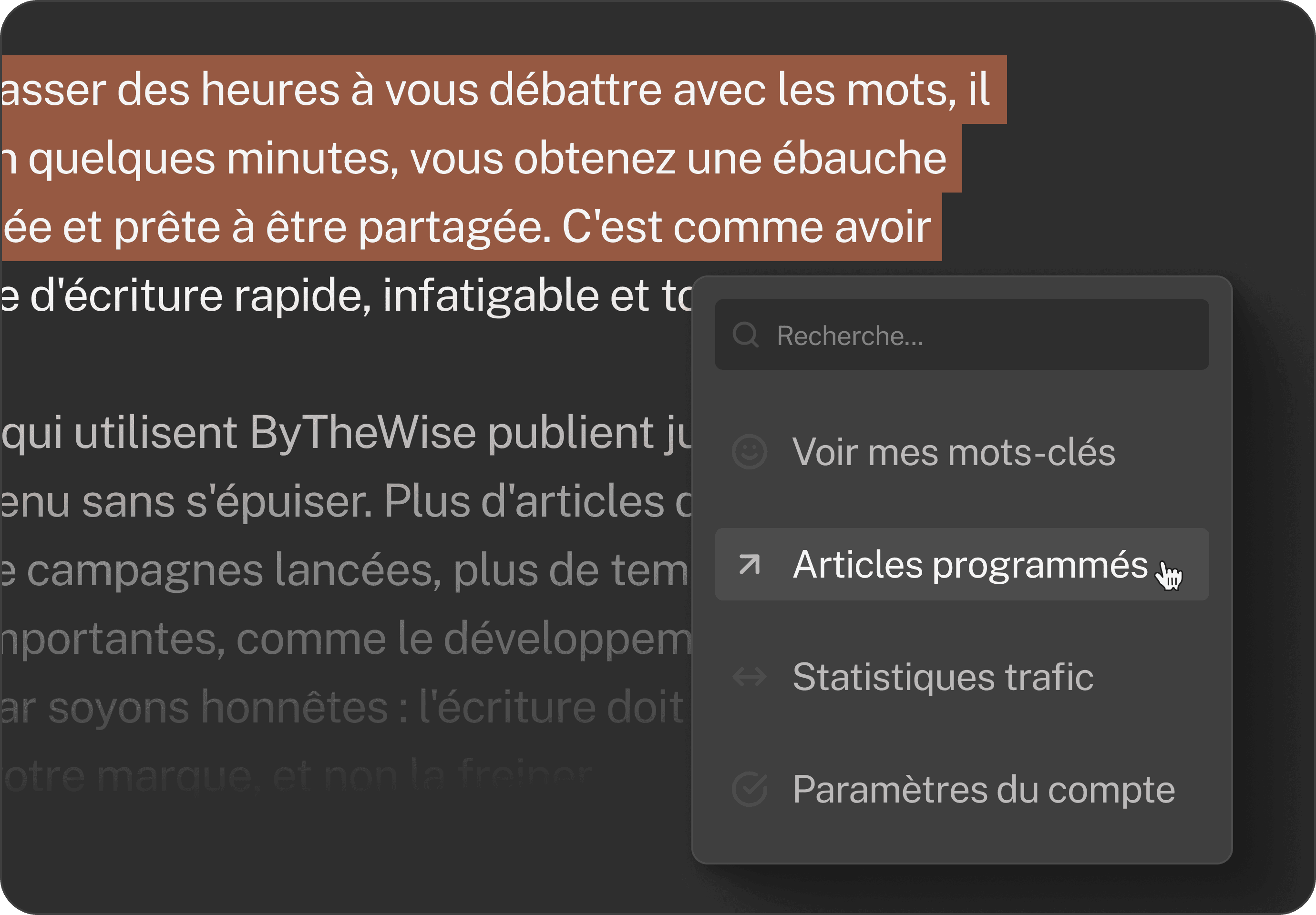 ByTheWise analyse les mots-clés performants, le comportement de vos visiteurs et les tendances SEO. Chaque article publié s'améliore grâce aux données des précédents. L'IA apprend et s'adapte.